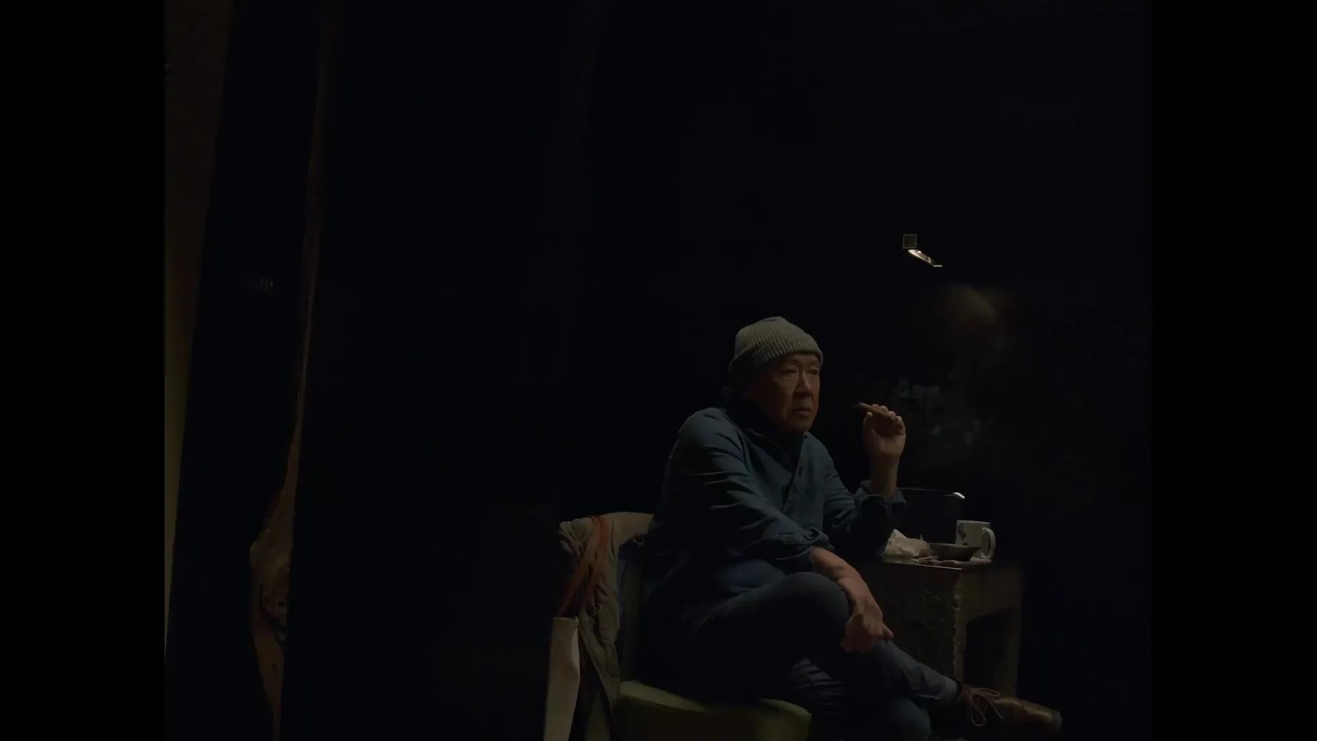 Focus shot of Chef Masa Takayama through some meshed sliding doors setting some table-wear.